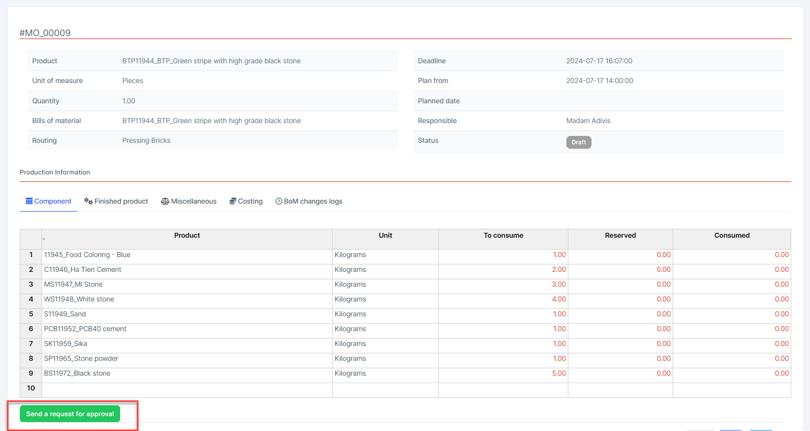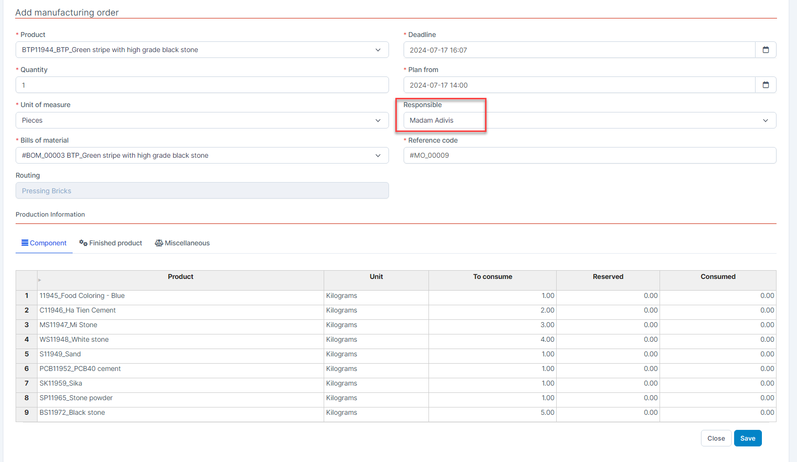 - Go to წარმოება orders under the წარმოება module --> select დამატება --> Fill in the required fields and select the responsible person --> save this manufacturing order.