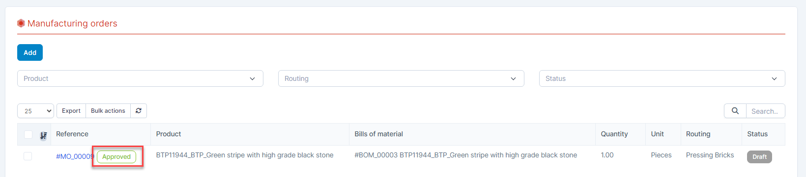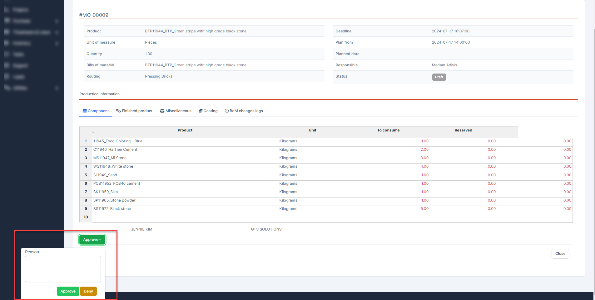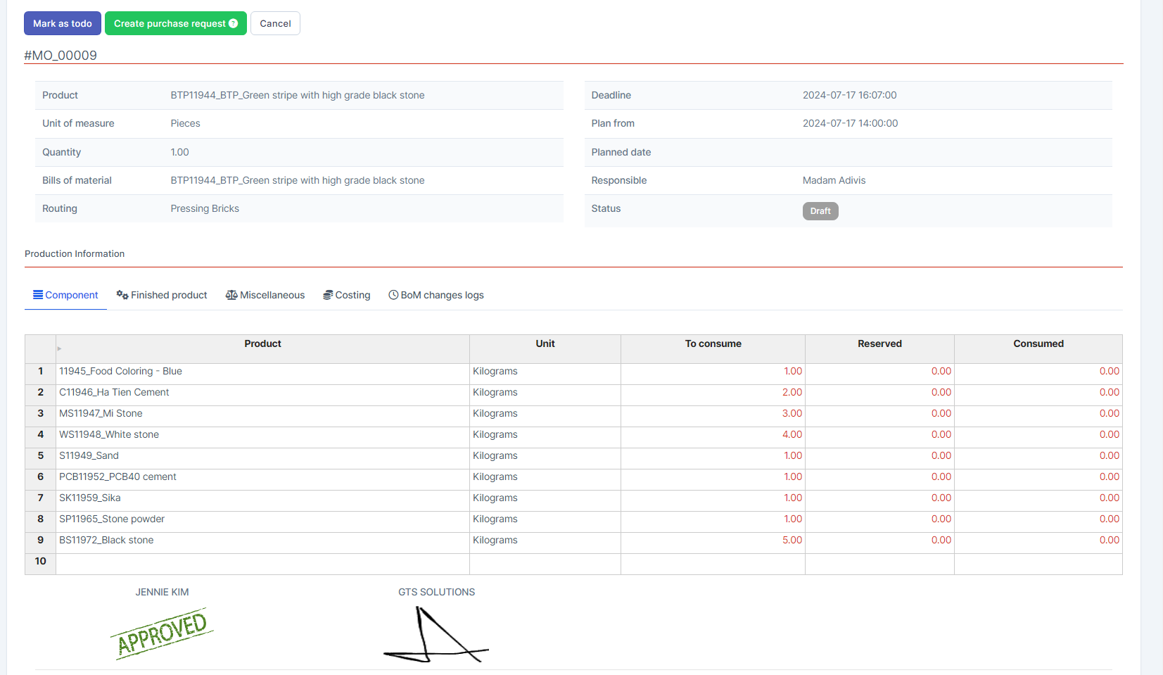 ნაბიჯი 3. After the MO has been approved, click "გასაკეთებლად მონიშვნა" to execute the MO. See related articles at https://helpcenter.gtssolution.vn/article/create-manufacturing-order-and-processing