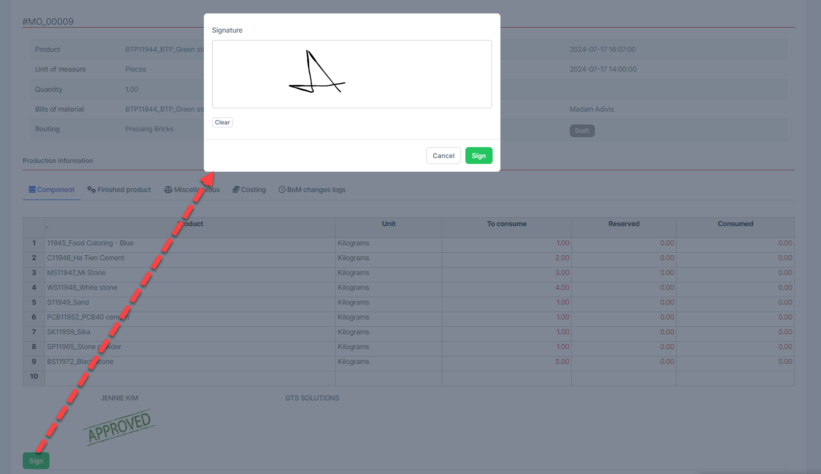 After the MO is approved by Jennie , the creator will receive a notification via email and web that the MO has been approved. - Next, log in to GTS Solution and draw a signature, then press ხელმოწერა