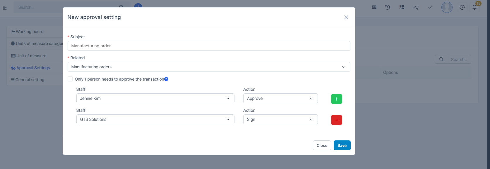 to remove a approver from the process - Check on "Only 1 person needs to approve the transaction" ( optional): - If checked, the approval will be completed when any one of the approvers approves.- If unchecked, the approval will be sequential: each approver must approve in the defined order. If any approver rejects the request, the approval process will stop, and the წარმოება რიგითობა (MO) will be marked as Rejected