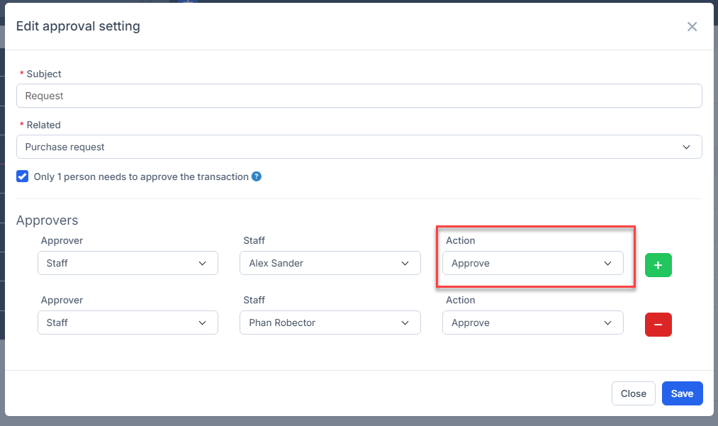 - Only 1 person needs to approve the transaction:If this option is enabled, all approvers in the process can simultaneously approve transactions, and only one of them needs to approve or sign for the transaction's status to change. დაკავშირებული article: https://helpcenter.gtssolution.vn/article/only-1-person-needs-to-approve-the-transaction