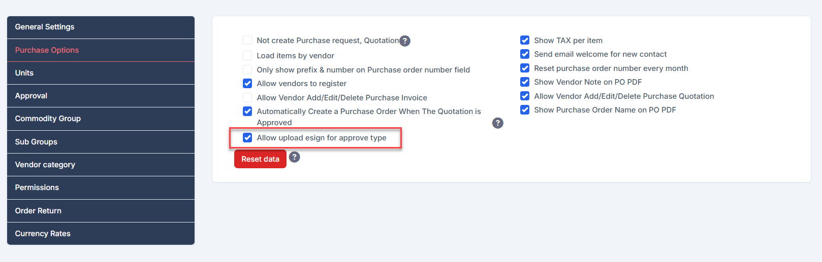 - ნაბიჯი 1. Go to პარამეტრები menu under შესყიდვები module from the left sidebar