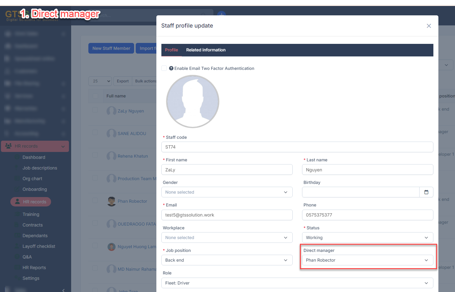 - Select დამტკიცებაr: თანამშრომლები or Direct manager or Department manager.- Direct manager: the approver is the direct manager of the transaction creator.