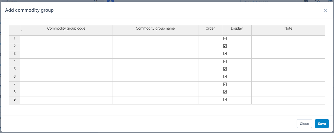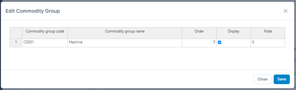 - რიგითობა: enter the display order number. Commodity groups with smaller numbers will appear at the top of the commodity group dropdown list.