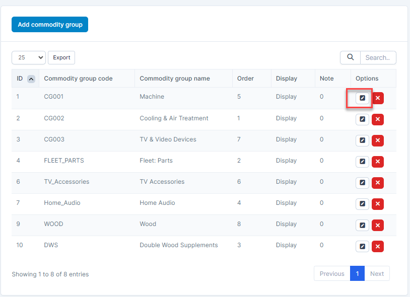 - ნაბიჯი 2. Select საქონლის ჯგუფი menu -> Hover over the commodity group to be edited and click რედაქტირება