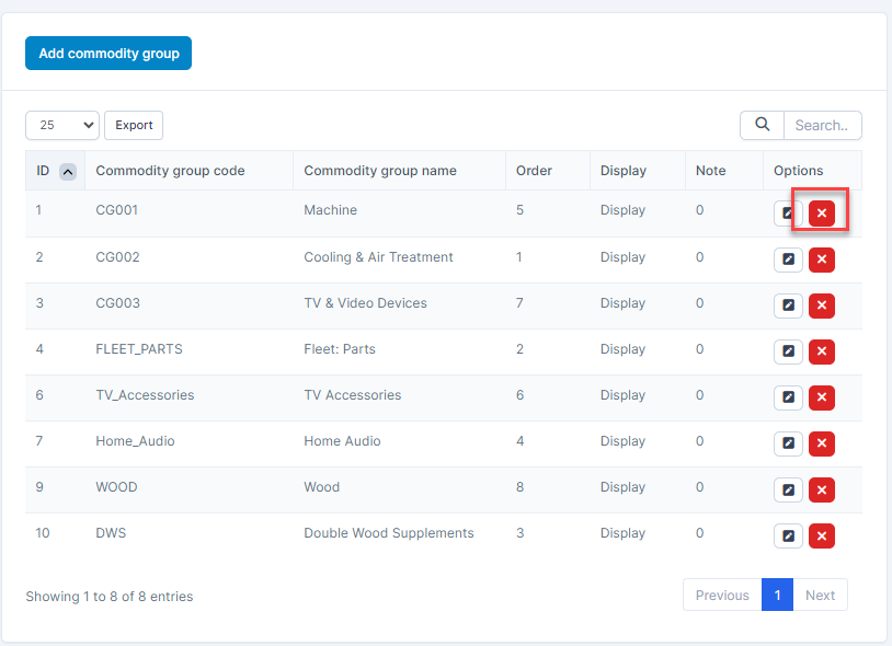 - ნაბიჯი 2. Select საქონლის ჯგუფი menu -> Hover over the commodity group to be deleted and click წაშლა