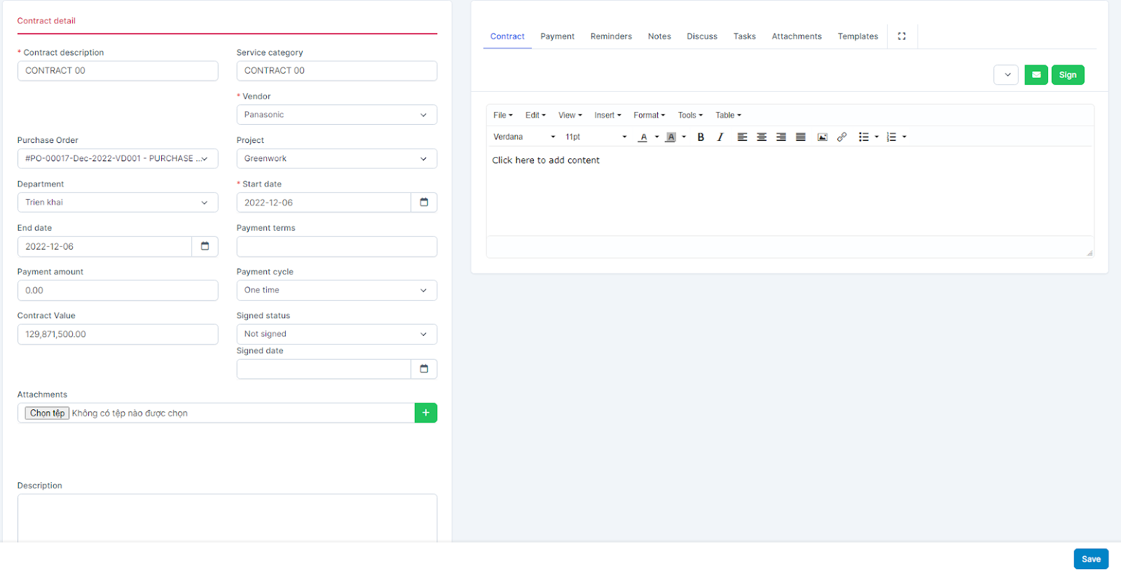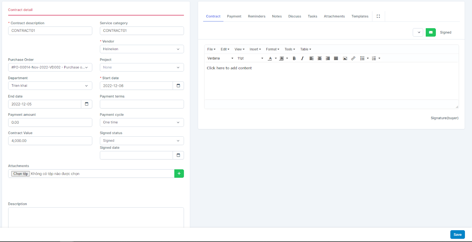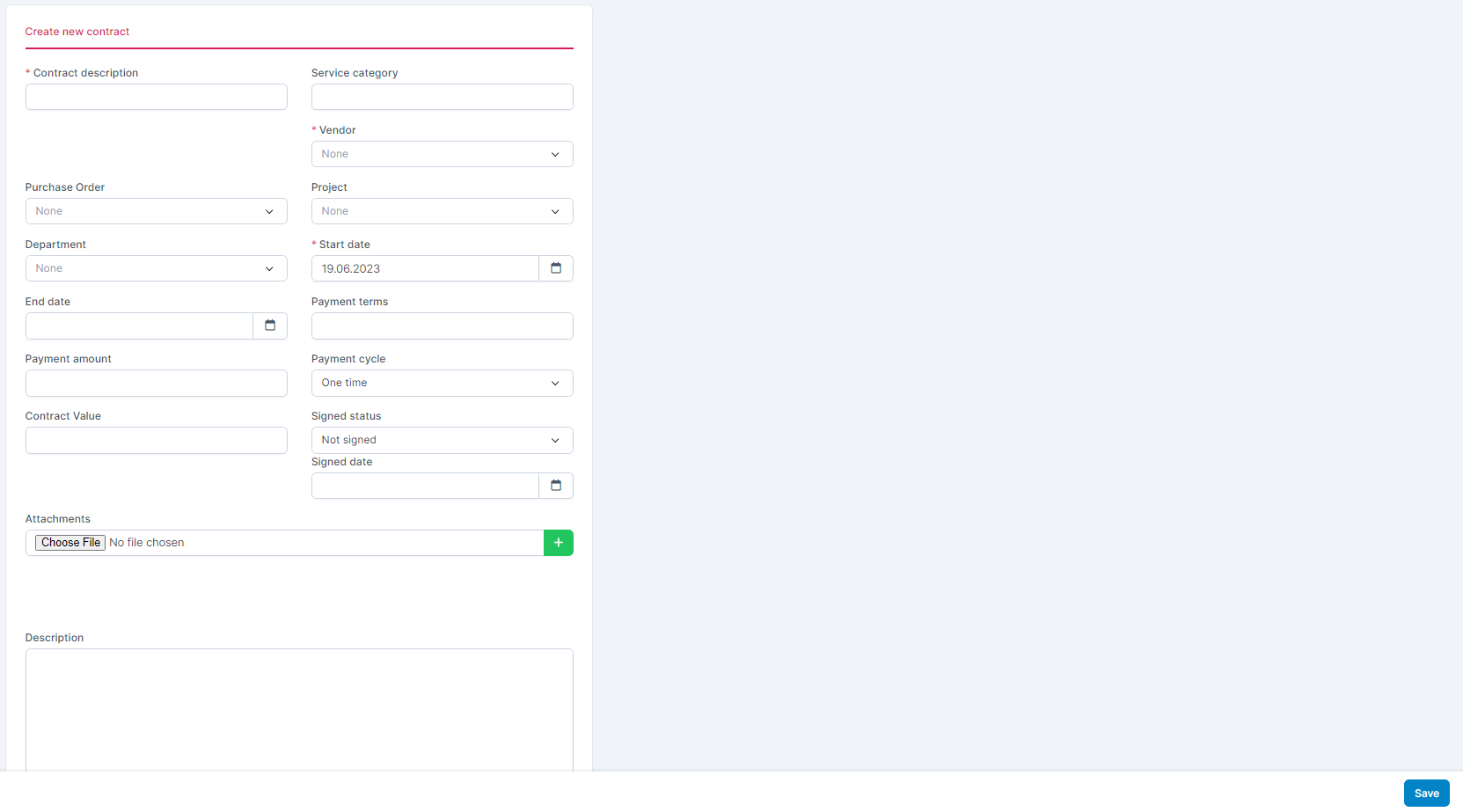 - ნაბიჯი 2. Click New and fill in required details and click შენახვა. After saving, the contract is displayed in the vendor portal