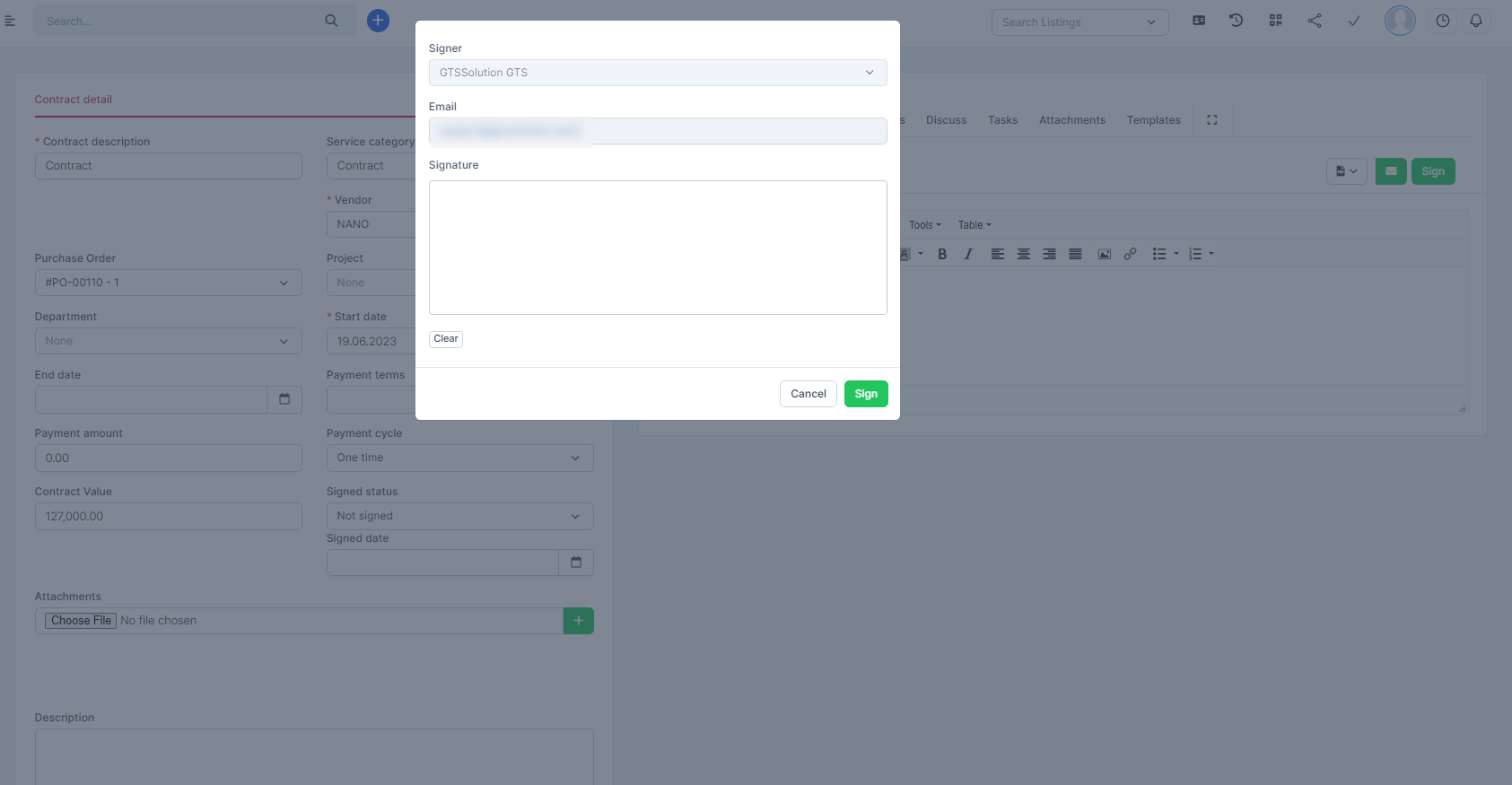 ხელმოწერაed status field: has 2 options: Not signed and ხელმოწერაed- If you select Not signed: display the SIGN button to sign the contract. All employees authorized for the კონტრაქტი menu can sign contracts