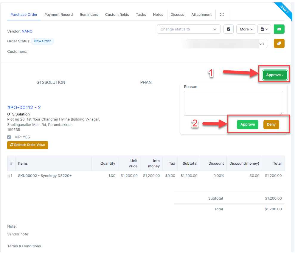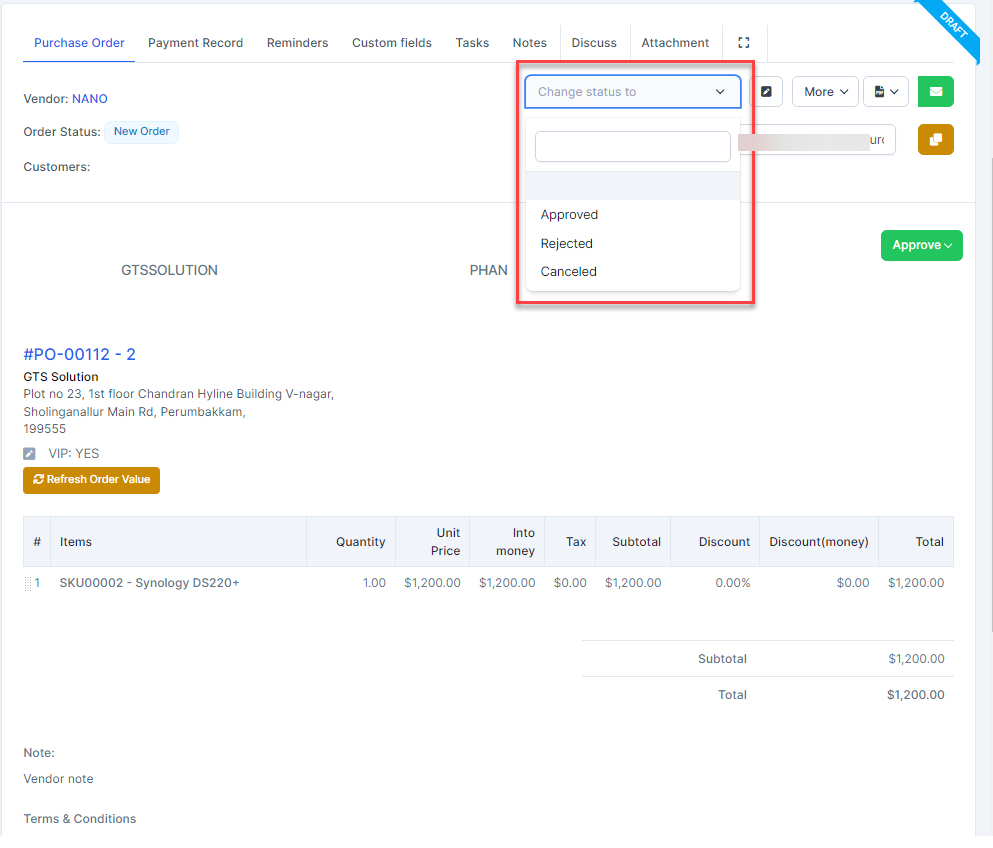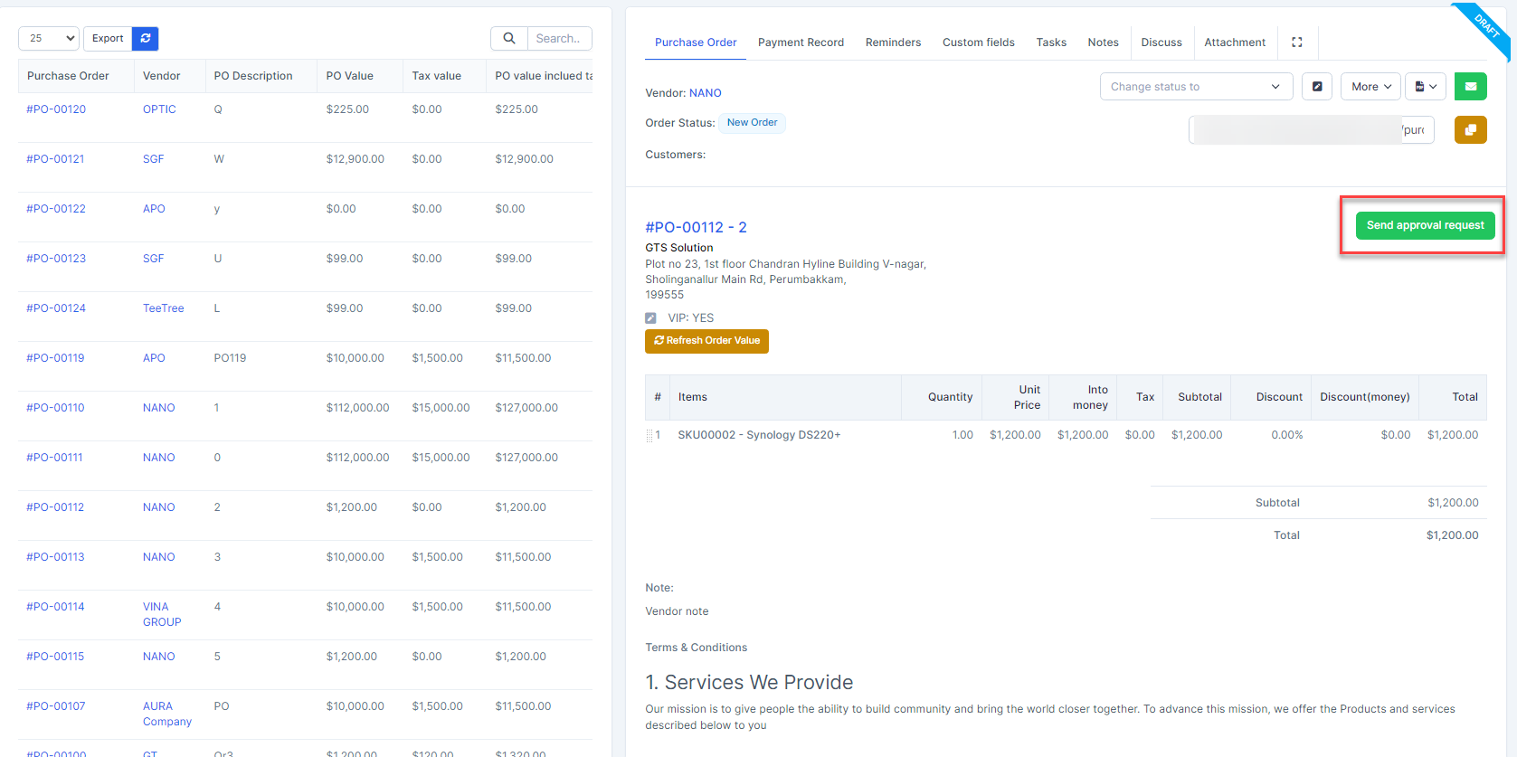 - ნაბიჯი 5. დამტკიცება purchase order(if there is an approval process)1. Select purchase order as Draft -> Click View2. Click Send approval request ⇒ notify you to send approval request successfully. დამტკიცებაrs receive approval request notifications via email and web