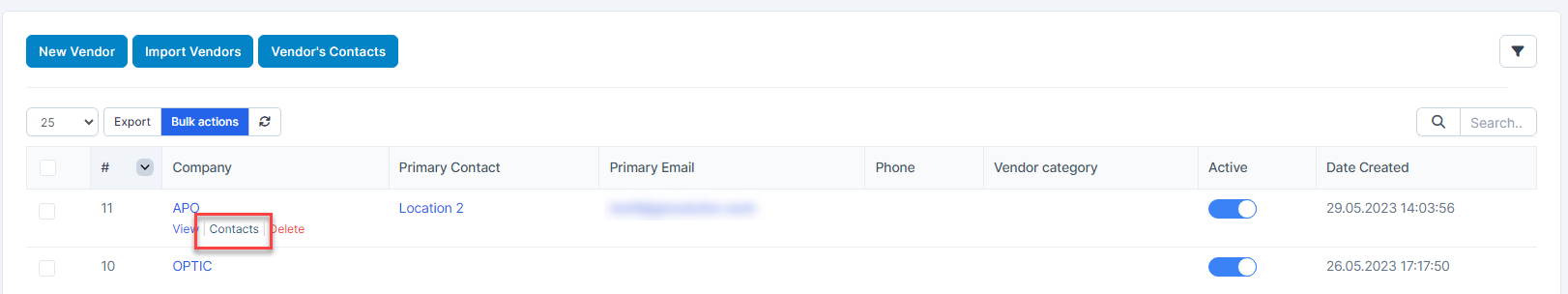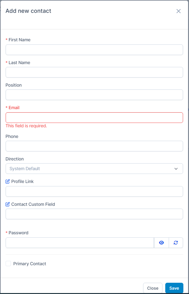 Email is uniqueCheck "Primary Contact" to make this contact the primary contact. This contact can see Profile Company and edit it. Opposite, If disable this option, this contact can't see Profile Company and edit it. Each vendor has only a primary contact.