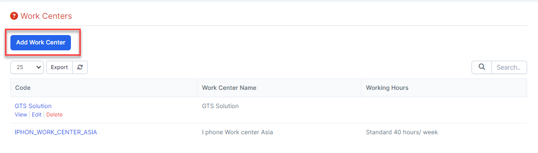 - ნაბიჯი 1. Go to სამუშაო ცენტრები menu under წარმოება module from the left sidebar.