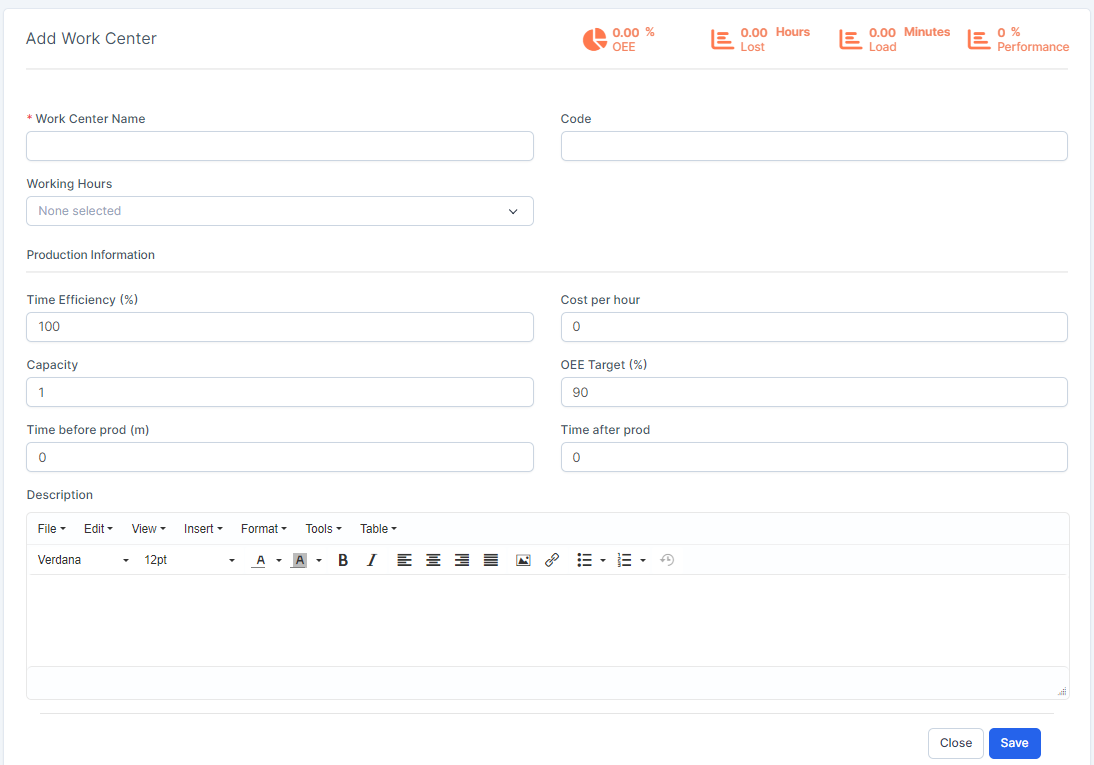 1. Enter the სამუშაო ცენტრი სახელი: give the work center a concise name that describes the type of operations it will be used for2. Enter the Code: assign the work center a reference code3. Select the Working Hours: define the number of hours that the work center can be in use each week4. Enter the Time Efficiency (%): used to calculate the expected duration of a work order at the work center; for example, if a work order normally takes one hour and the efficiency is set to 200%, the work order will take 30 minutes. Currently, this field data is for storage only.5. Enter the ღირებულება საათში: the cost of operating the work center for one hour6. Enter the Capacity: the number of operations that can be performed at the work center simultaneously. Currently, this field data is for storage only.7. Enter the OEE Target (%): the target for efficiency at the work center8. Enter the Time before prod (m): setup time required before work can commence. Currently, this field data is for storage only.9. Enter the Time after prod: breakdown or cleanup time required after work is finished. Currently, this field data is for storage only.10. Enter the აღწერა - ნაბიჯი 4. Click on the შენახვა button