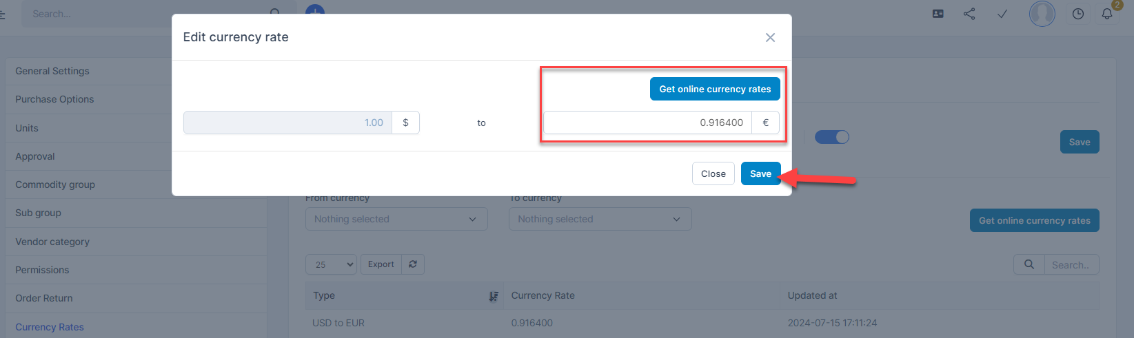 Enter currency rate manually or click Get online currency rates -> then click შენახვა