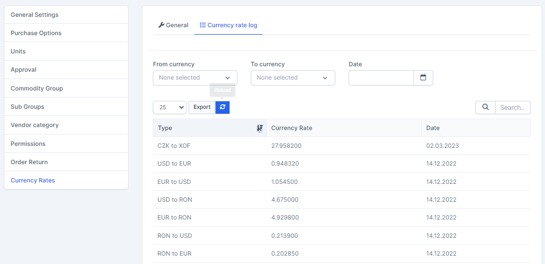 Currency Rate logs tab