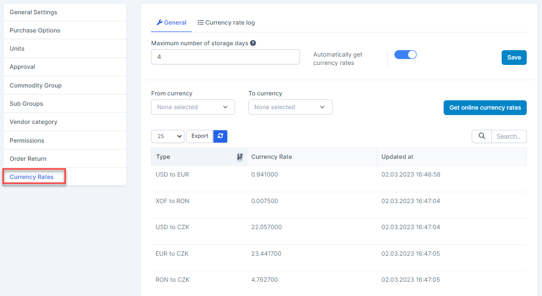 - Automatically get currency rates: used to automatically update the online currency rate at 6pm every day and log in the Currency Rate logs tab