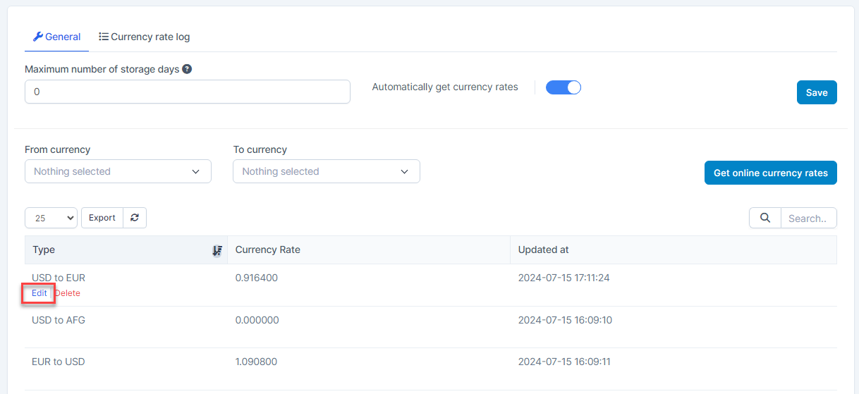 - You can edit the currency rate of each line by hovering over the line you want to edit and clicking რედაქტირება