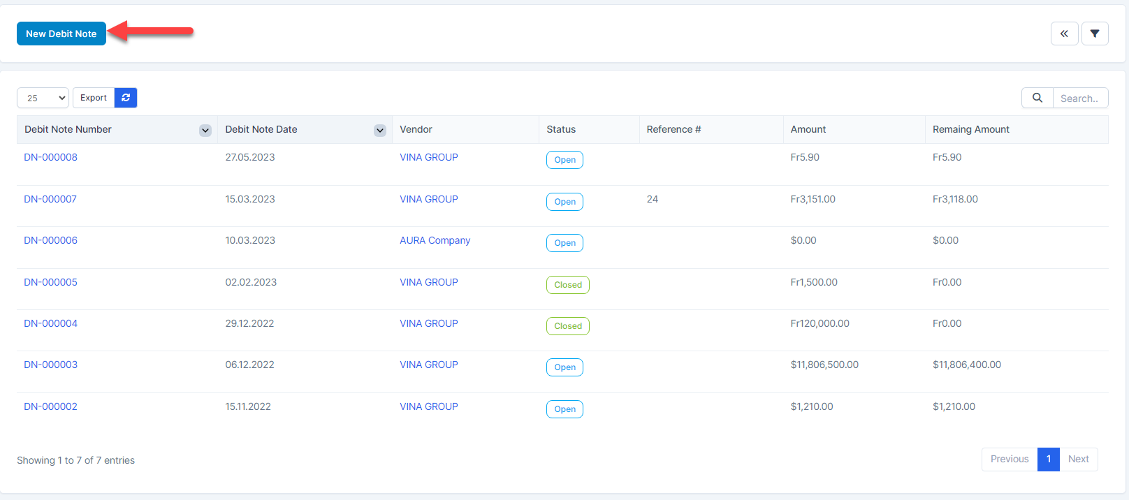 - ნაბიჯი 1. Go to Debit შენიშვნაs menu under შესყიდვები module from the left sidebar -> Click New Debit შენიშვნა button
