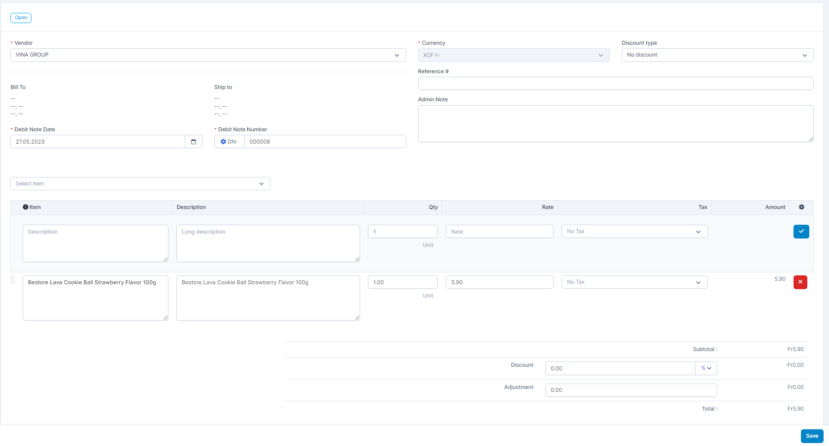 1. Select the მომწოდებელი2. Select the Discount type 3. Enter the Debit შენიშვნა Date 4. Select or enter the item, enter the Qty and Rate. Then click