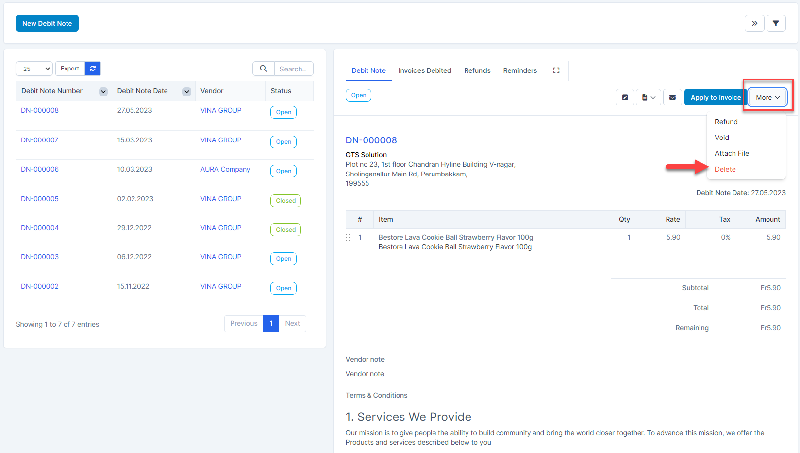 Only debit notes that have not been invoiced debited and refund are allowed to be deleted.