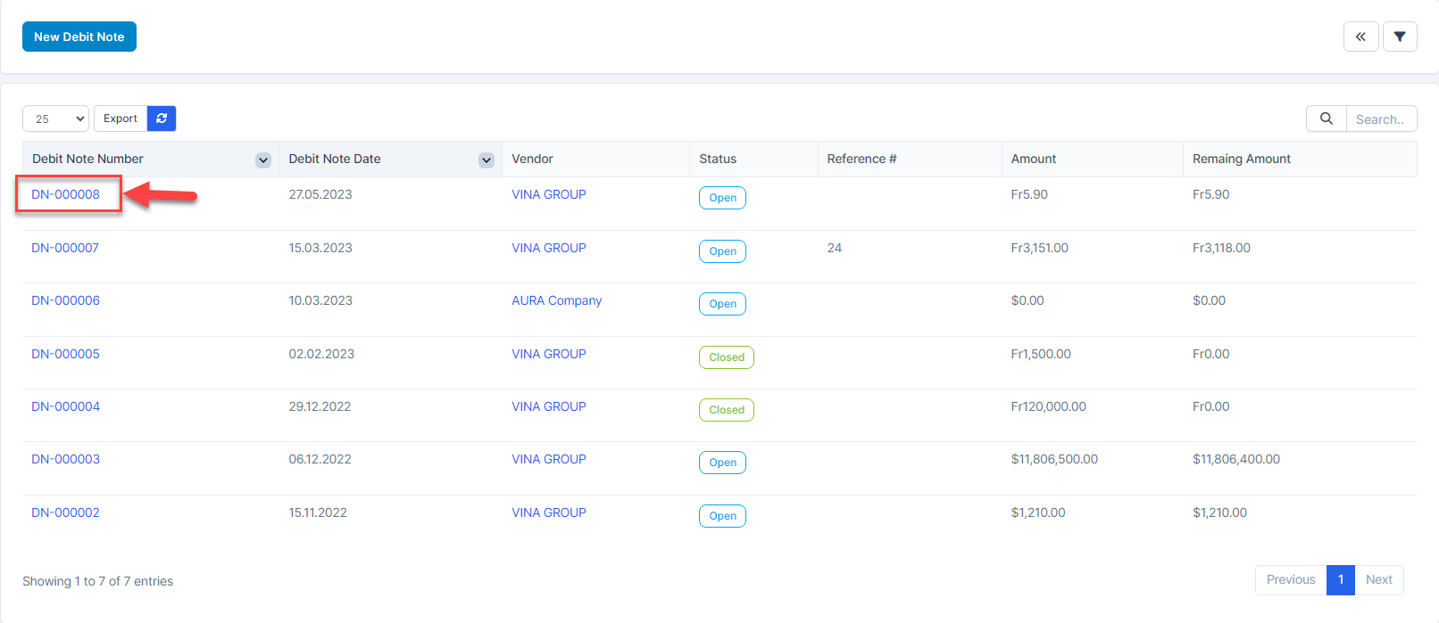 - ნაბიჯი 1. Hover over a Debit შენიშვნა -> click Debit შენიშვნა Number hyperlink