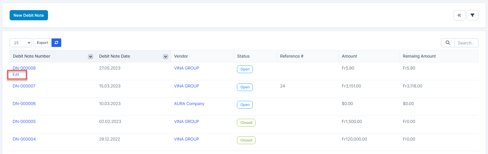 - ნაბიჯი 1. Select a debit note to edit and click რედაქტირება.