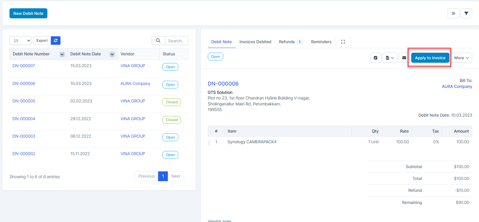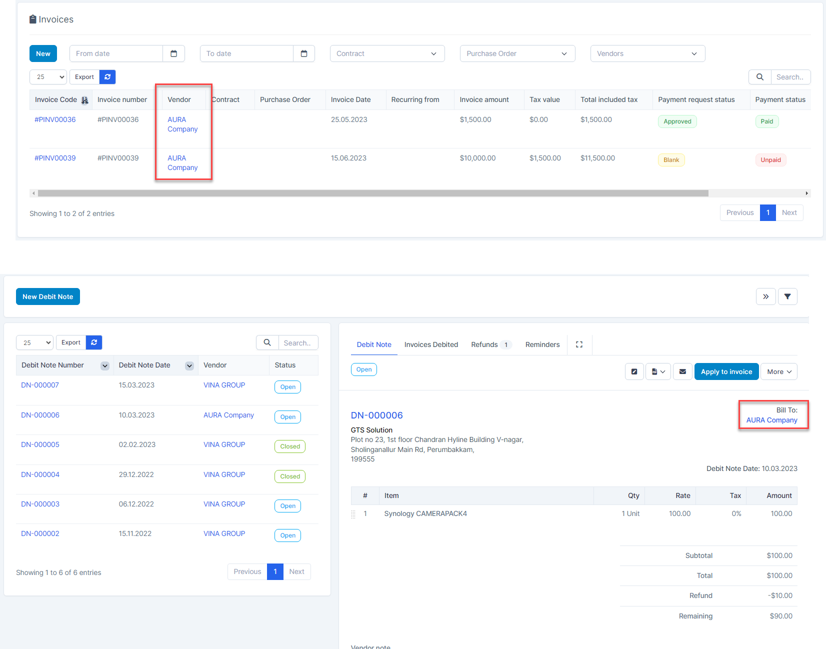 Debit შენიშვნა is only be applied to the invoice related to that vendor.