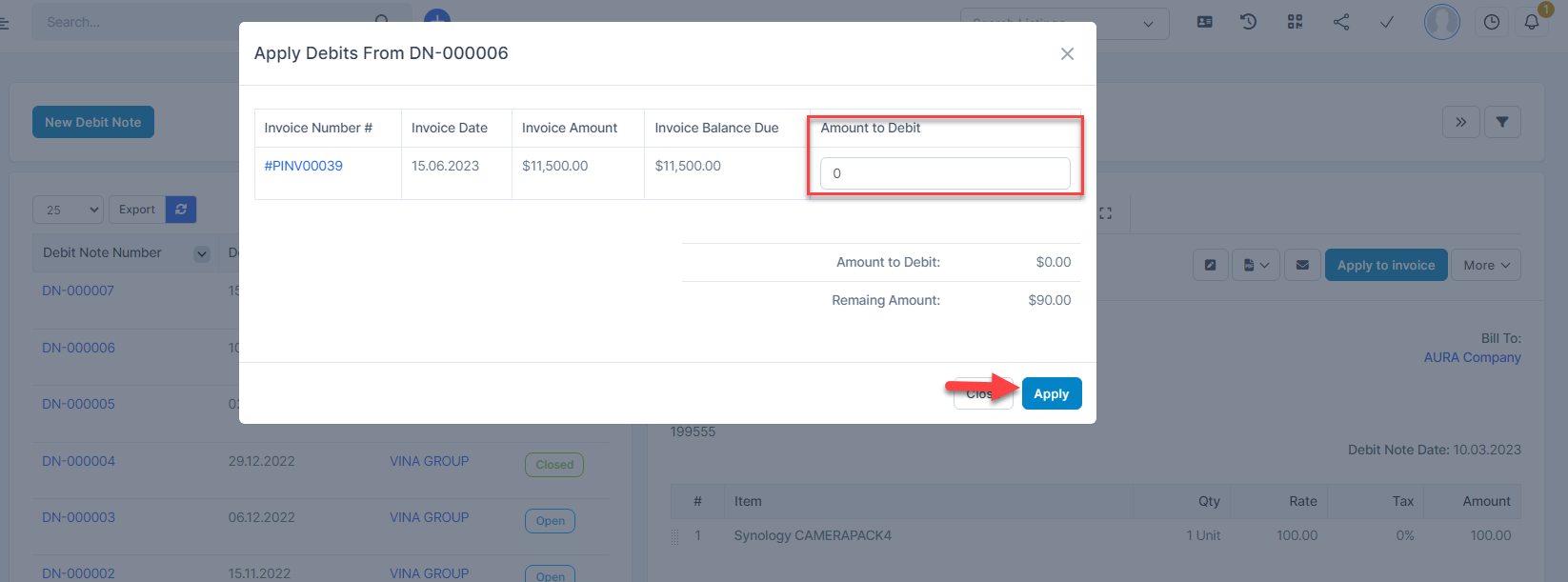 შენიშვნა: Amount to Debit must be less than or equal to Remaining debit.