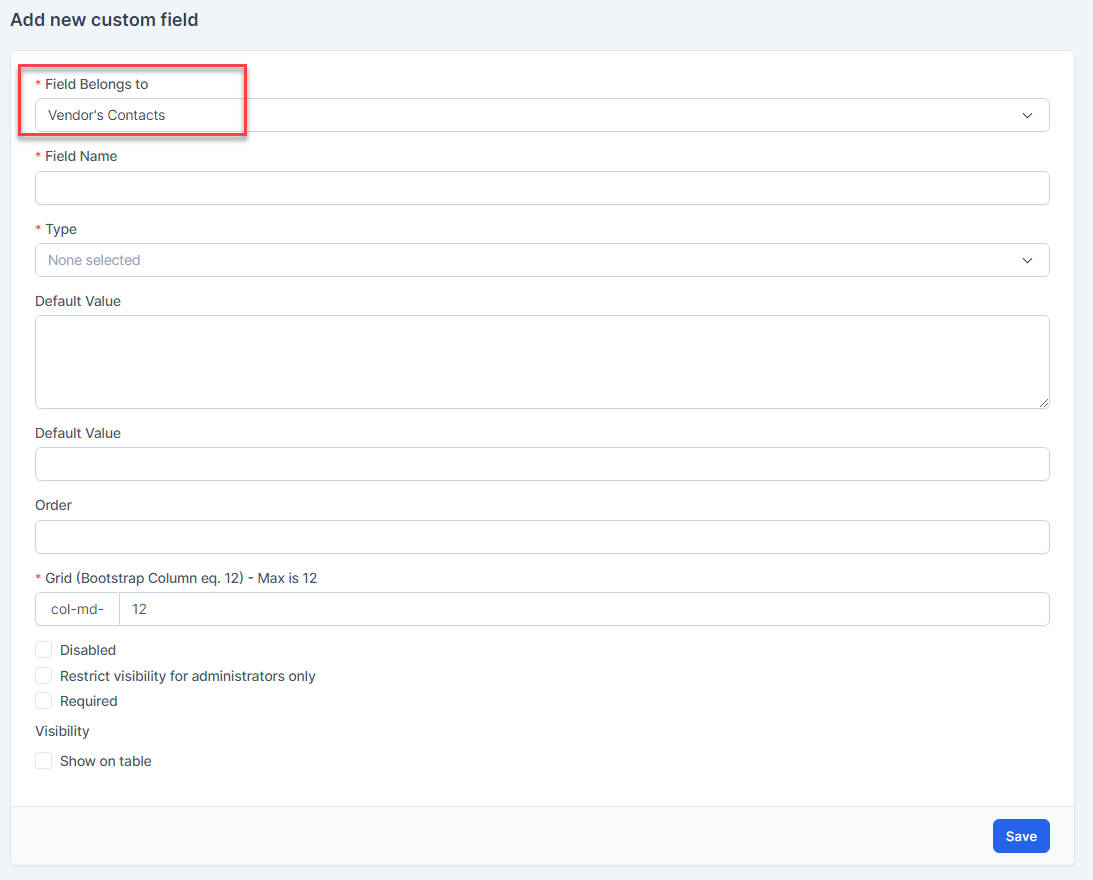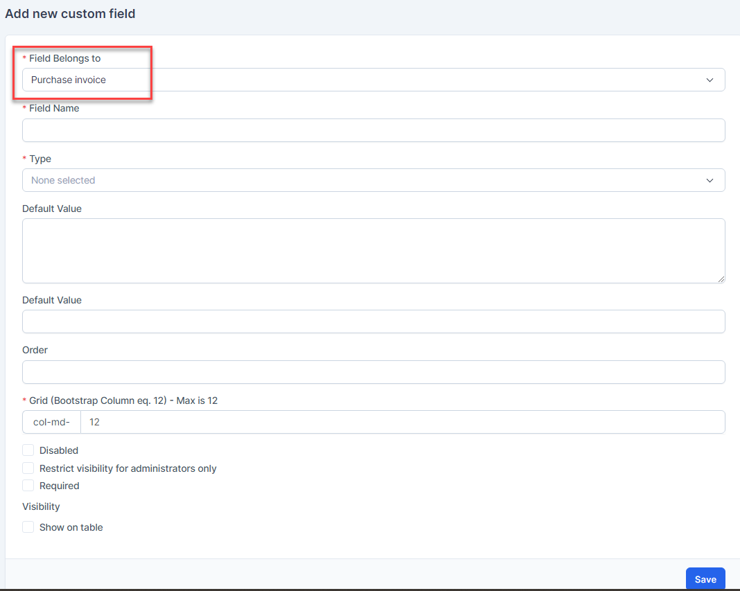 Used to create custom fields for მომწოდებელი, მომწოდებელი contact, შესყიდვები order and შესყიდვები Invoice