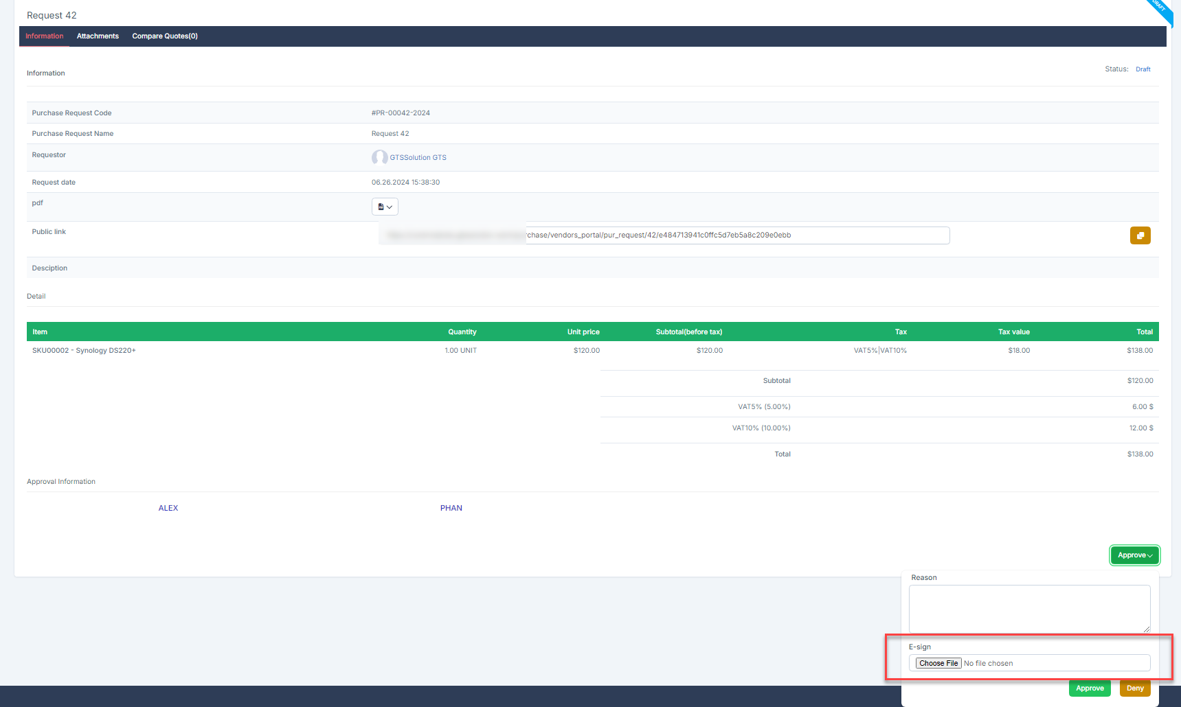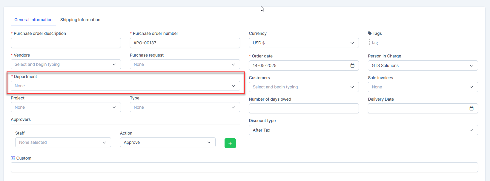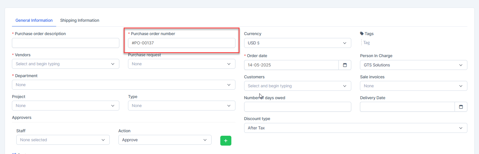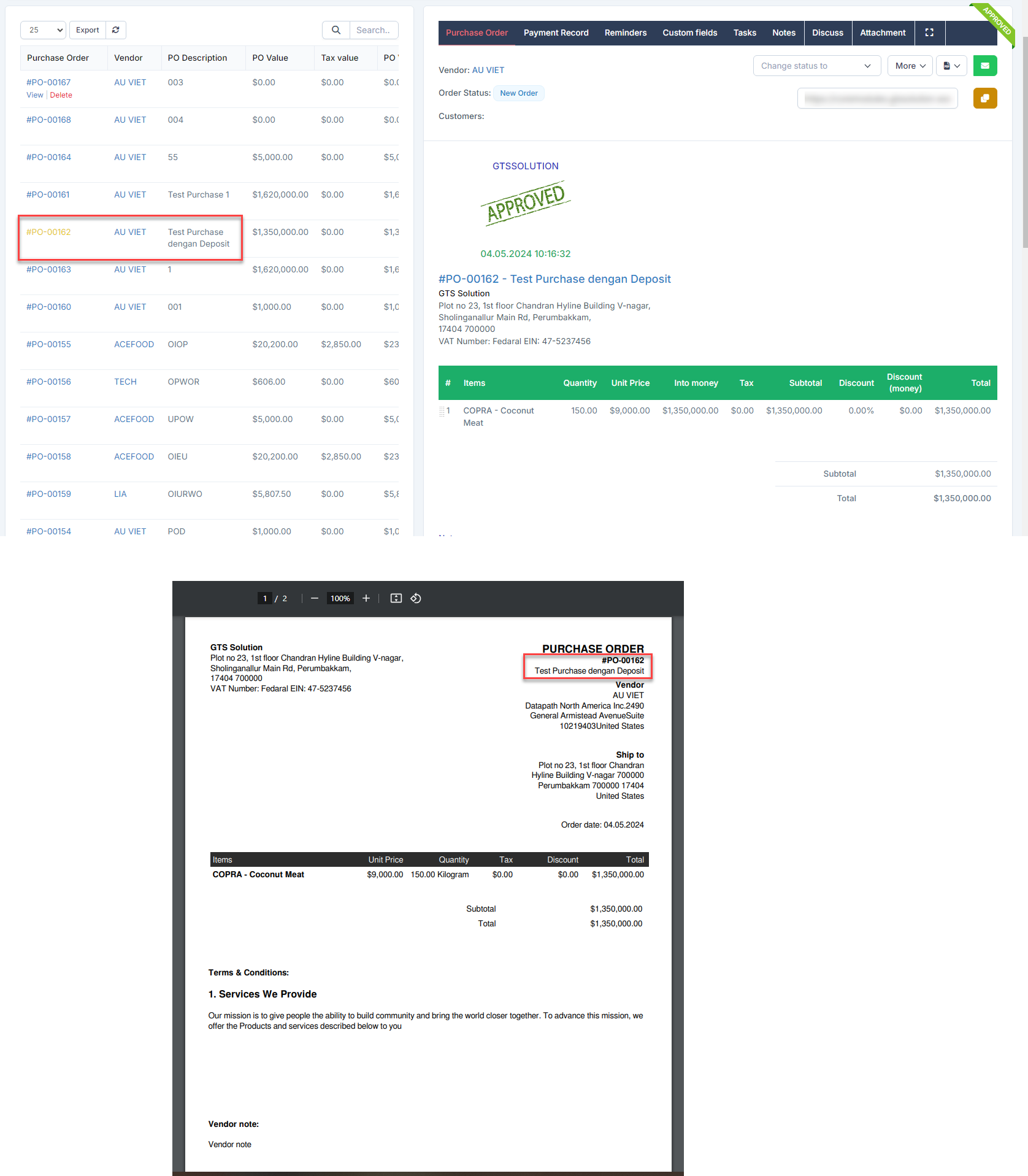 - Can select approvers on purchase order form: allows you to choose an approver for each purchase order without depending on the approval setting.You can view more details at: https://helpcenter.gtssolution.vn/article/select-approver-on-the-addedit-po-form