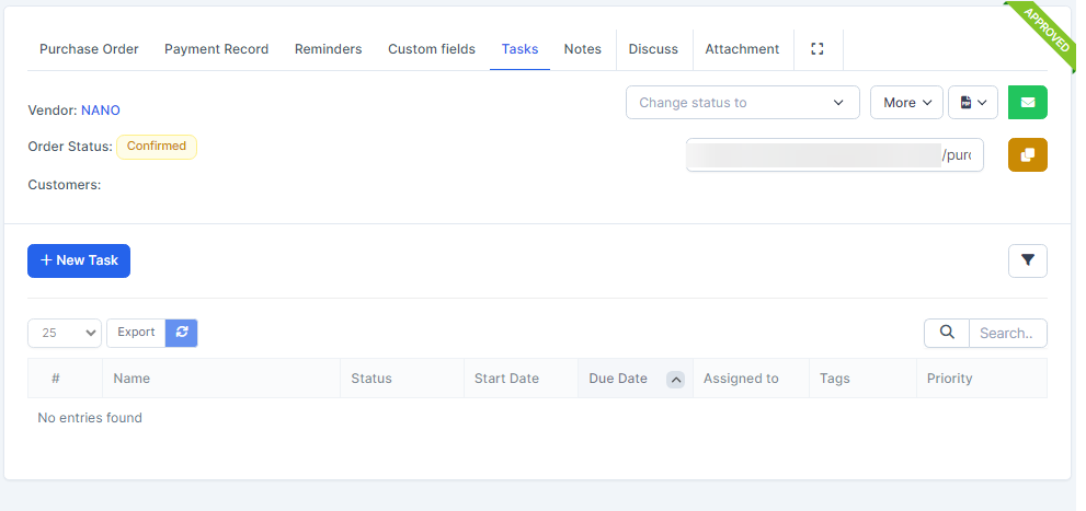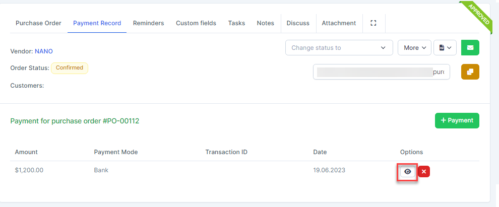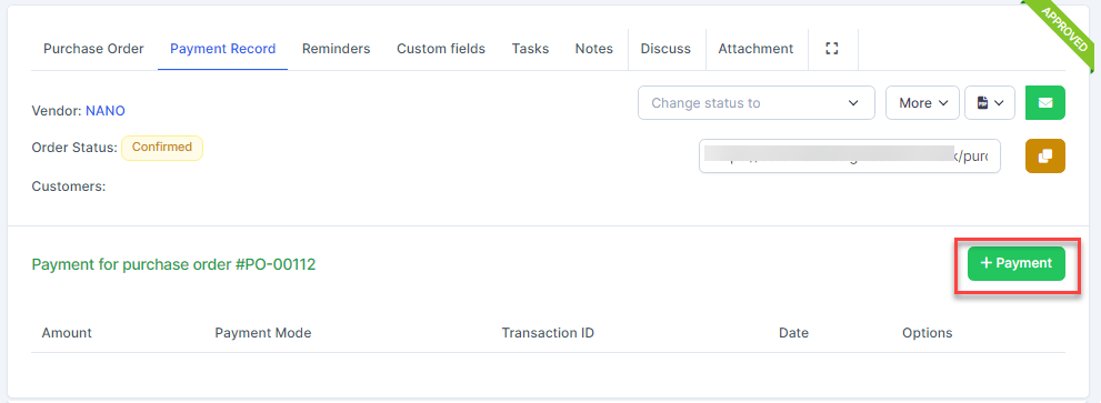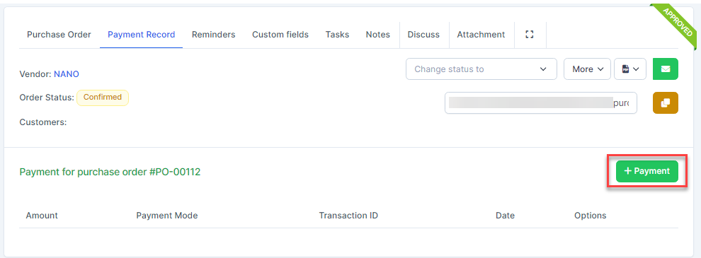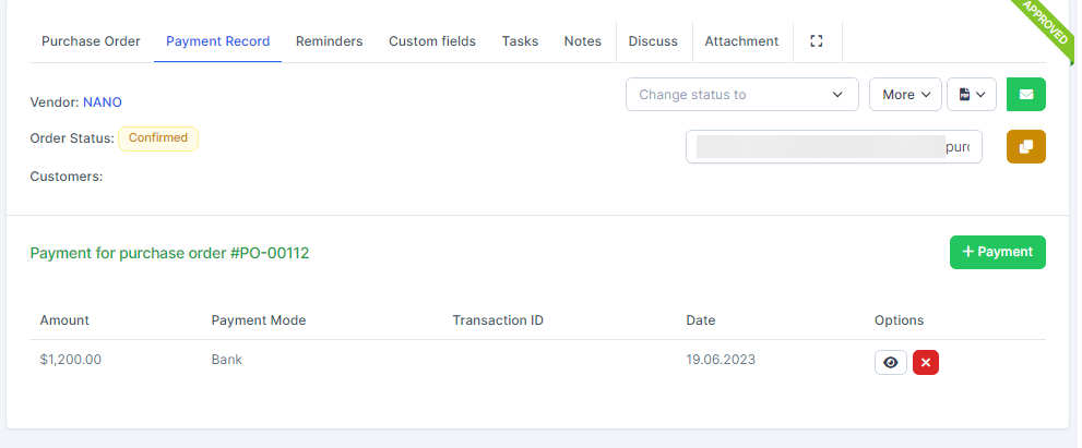 - In case the შესყიდვები order already has an invoice, when clicking Payment, the შესყიდვები invoice is automatically filled in for paymentნაბიჯი 1. Create approval process for Payment request ( if necessary) at approval setting.ნაბიჯი 2. Go to purchase order detail -> Select Payment Record tab -> click Payment button