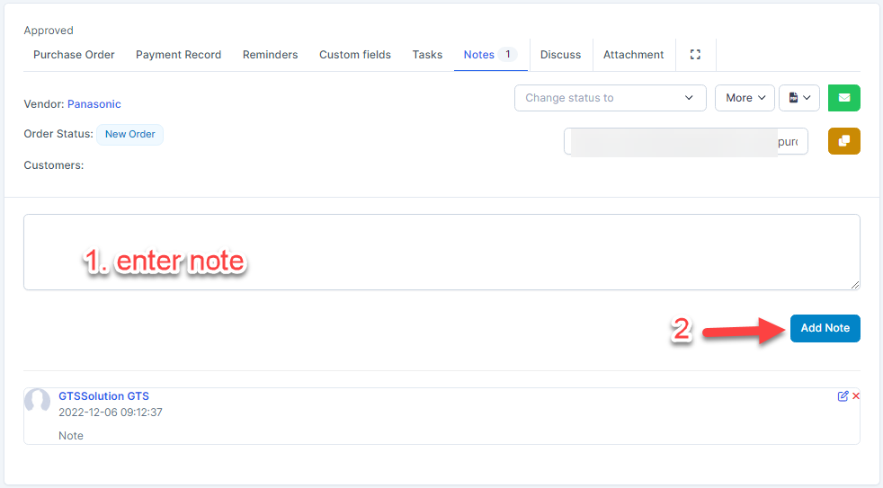 Buyer creates multiple notes related to this purchase order. მომწოდებელი can't see these notes