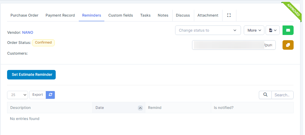 Click Refresh რიგითობა Value to update order value according to the item's current purchase price. This button is only visible when the purchase order has Draft, Rejected and Canceled status.