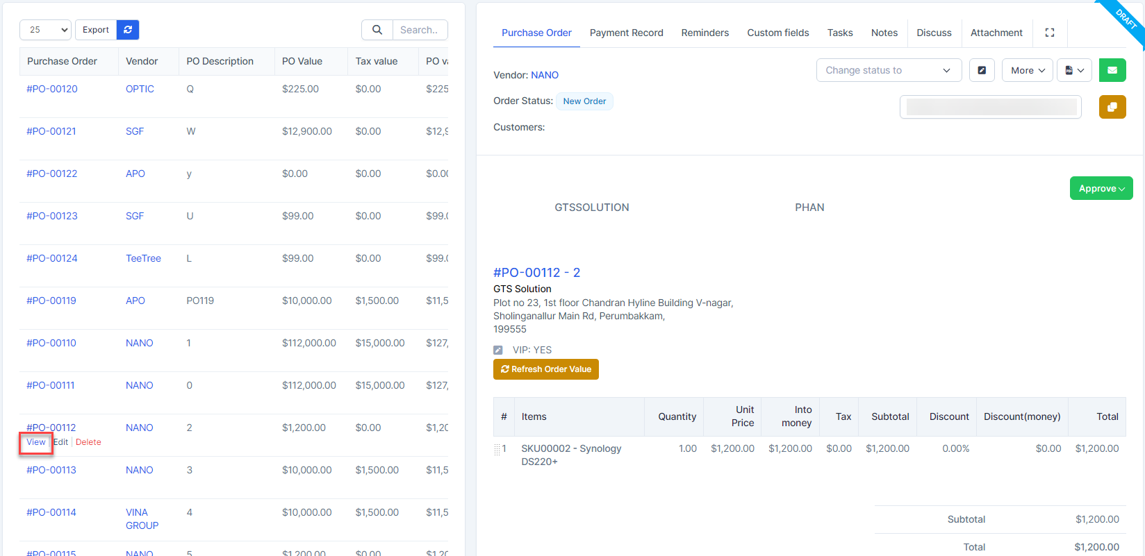 Select the purchase order to view details and click View