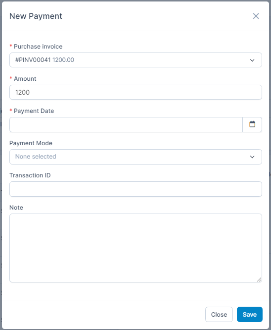 ნაბიჯი 3. Select purchase invoice, enter the amount, select Payment Date and Payment Mode -> then click შენახვა