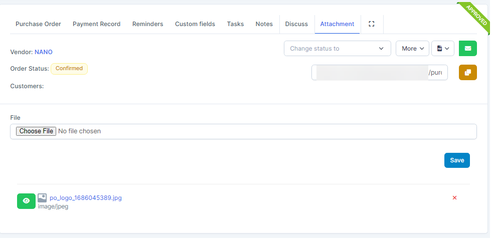 Used to attach files related to this purchase order. Both buyer and vendor can attach files and see all attached files for this purchase order