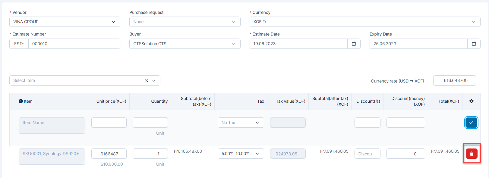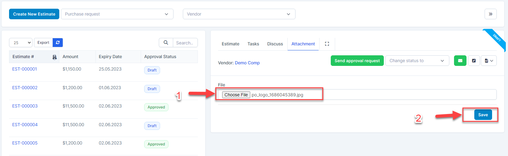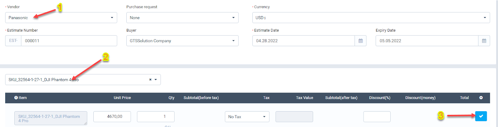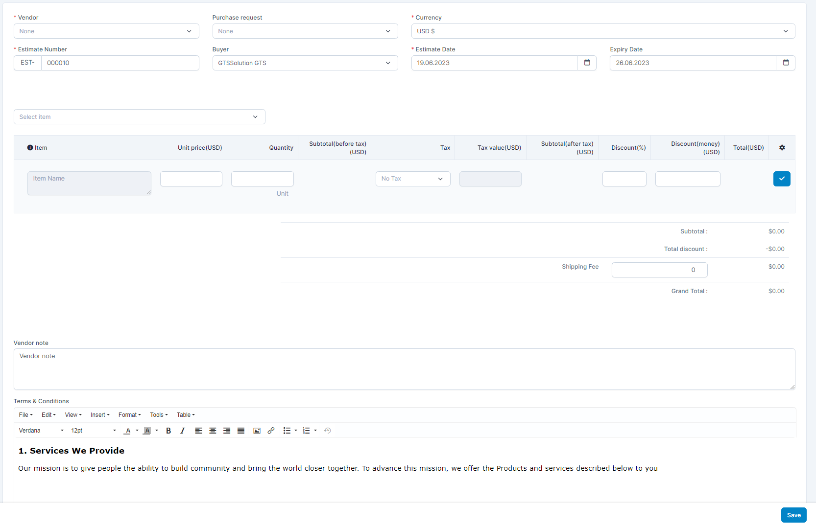 3. Select the Currency4. Select Buyer5. Select Estimate Date and Expiry Date - ნაბიჯი 4. Click შენახვა button ==> Quotation is successfully created and displayed in the corresponding vendor portal account