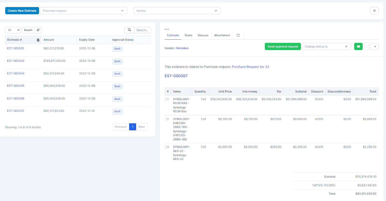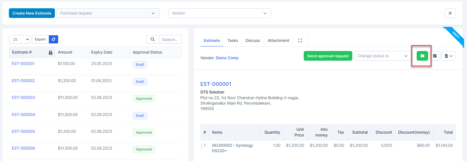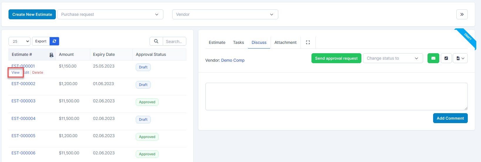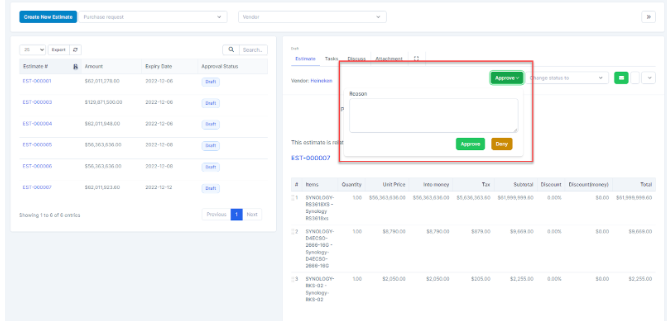 - ნაბიჯი 5. დამტკიცება quotation (if there is an approval process)1. Select Quotations as Draft -> Click View2. Click Send approval request ⇒ notify you to send approval request successfully. დამტკიცებაrs receive approval request notifications via email and web