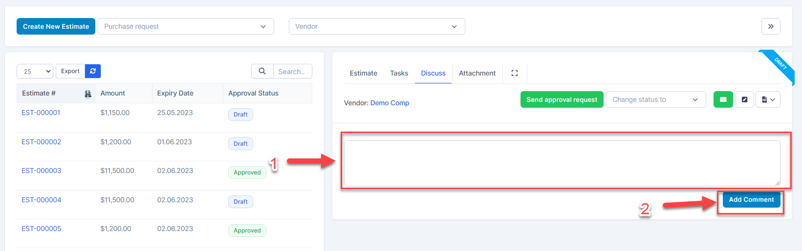To make the exchange between the buyer and the vendor more convenient, you can use the Discuss tab for the buyer and the vendor to enter the content to be exchanged. Both buyers and vendors can see each other's comments.
