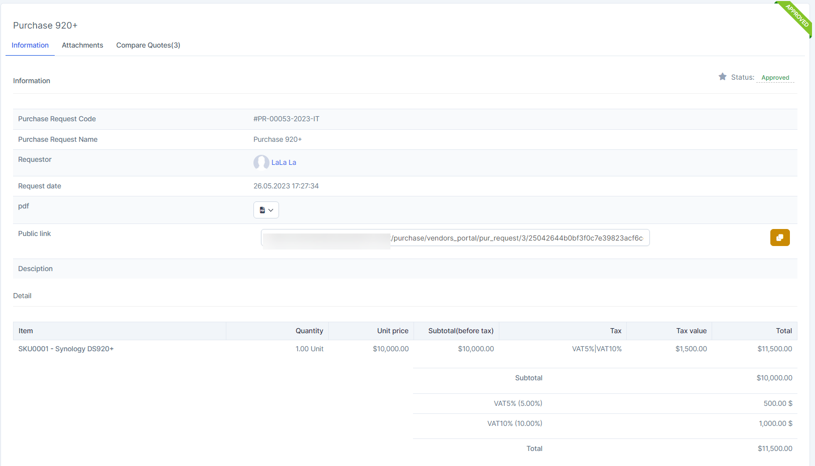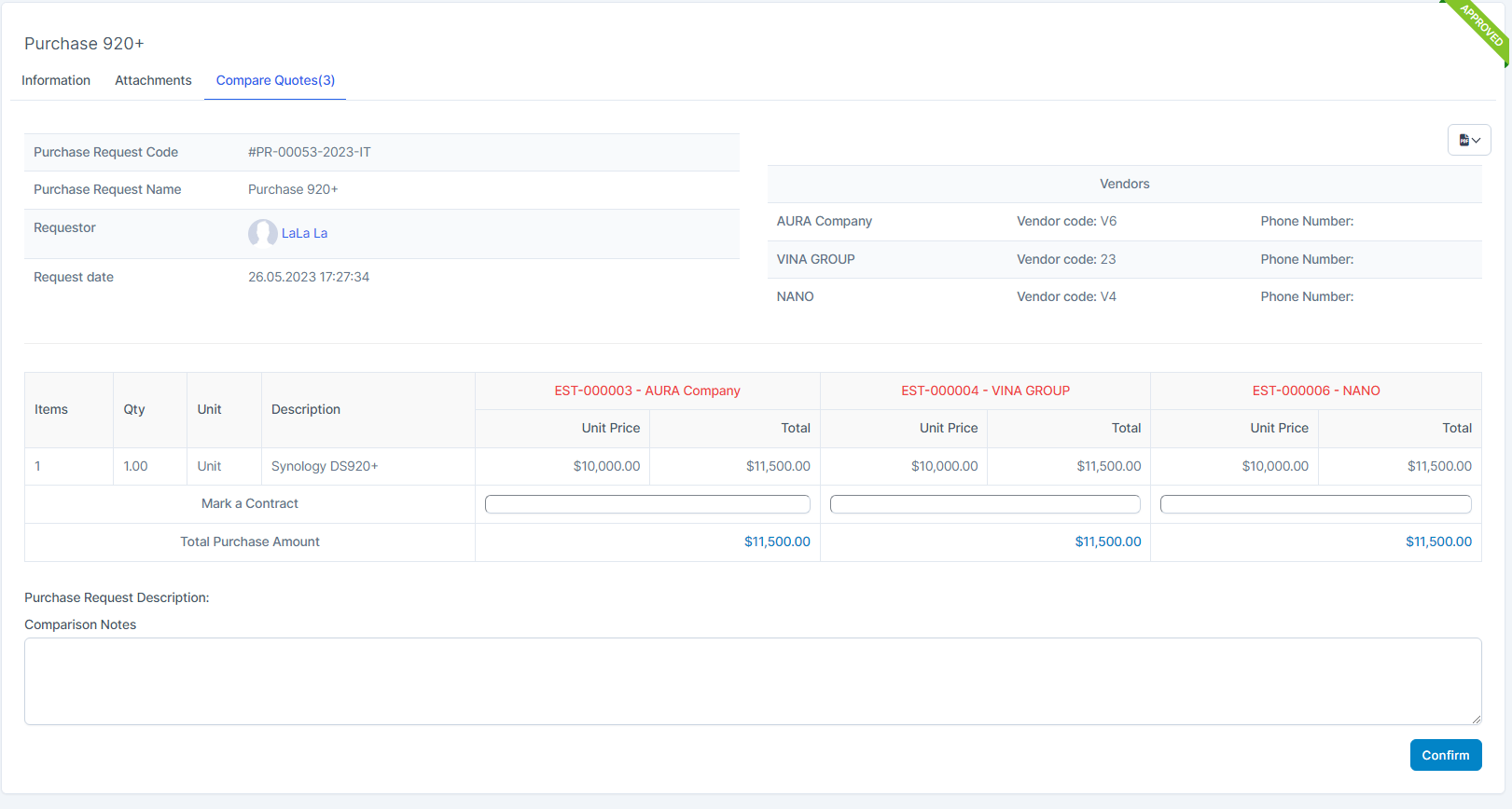Compare Quotation: show all quotes created from purchase request. Used to compare quotation of vendors.
