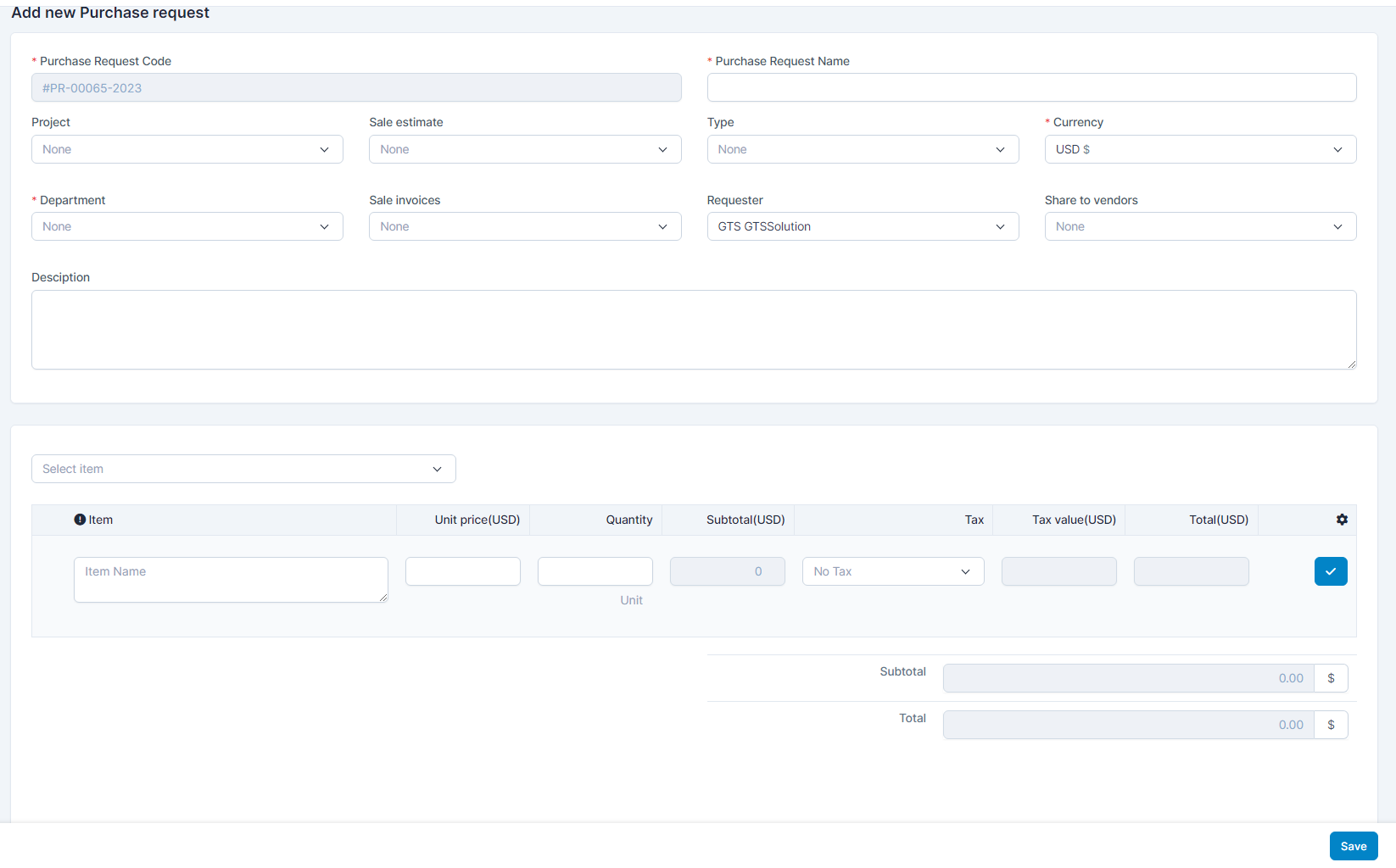 1. Enter the შესყიდვები Request სახელი.2. Select the Project.3. You can create a purchase request from Sales Estimate or Sale invoice and available items or enter arbitrary names for undefined items.Sale estimate: get estimates with states Draft , Send , Expired. Accepted (except Declined).Sale invoices: Get all invoices except the one with Draft and Cancelled status.4. Select the Currency.5. Select the Department.6. Select Requester.7. Select Share to vendor: After purchase request is selected დამტკიცებაd⇒ vendor can see this purchase request in their portal.8. Enter the აღწერა. - ნაბიჯი 4. Click შენახვა button