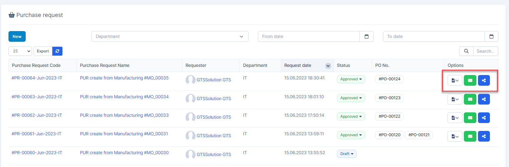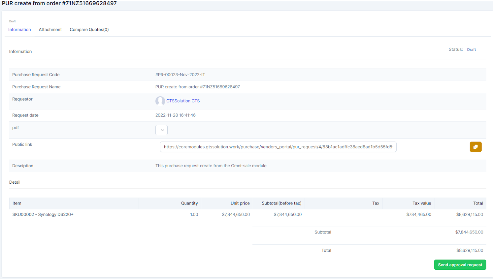 - ნაბიჯი 6. After purchase request status is დამტკიცებაd -> allow View PDF, Send Request Quotation email and Share PR to vendor
