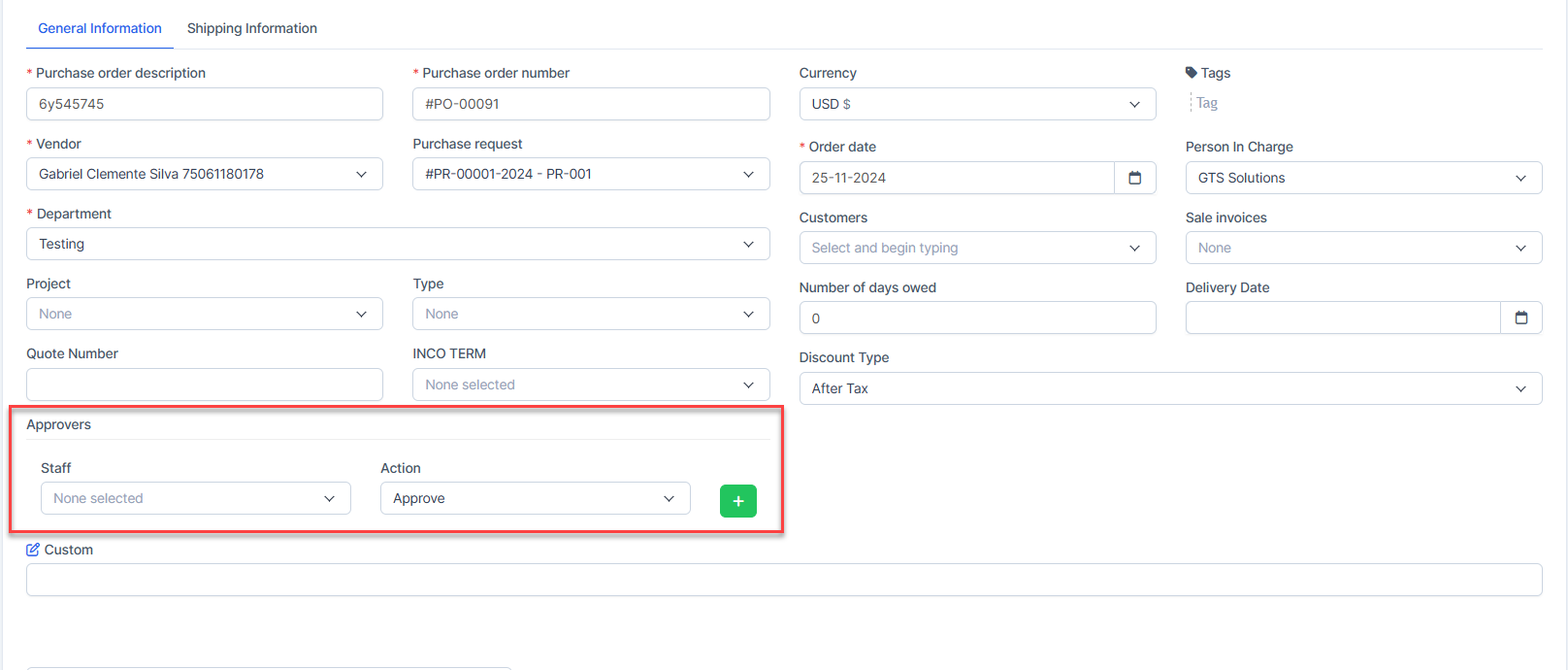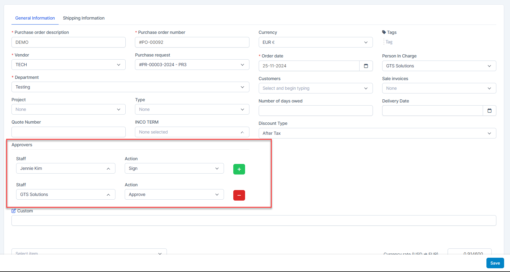 - ნაბიჯი 2. Go to შესყიდვები რიგითობა menu -> create purchase order and select approver -> then შენახვა