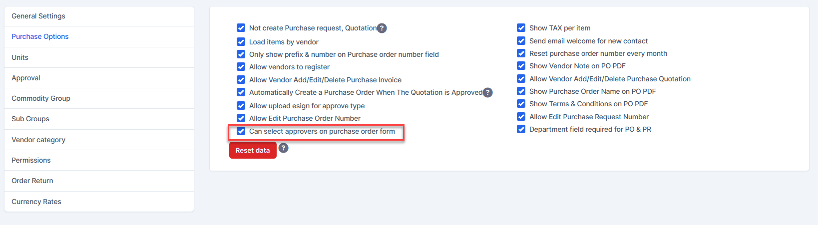 - ნაბიჯი 1. Go to პარამეტრები menu -> შესყიდვები Options --> enable "Can select approvers on purchase order form"