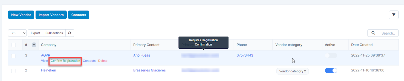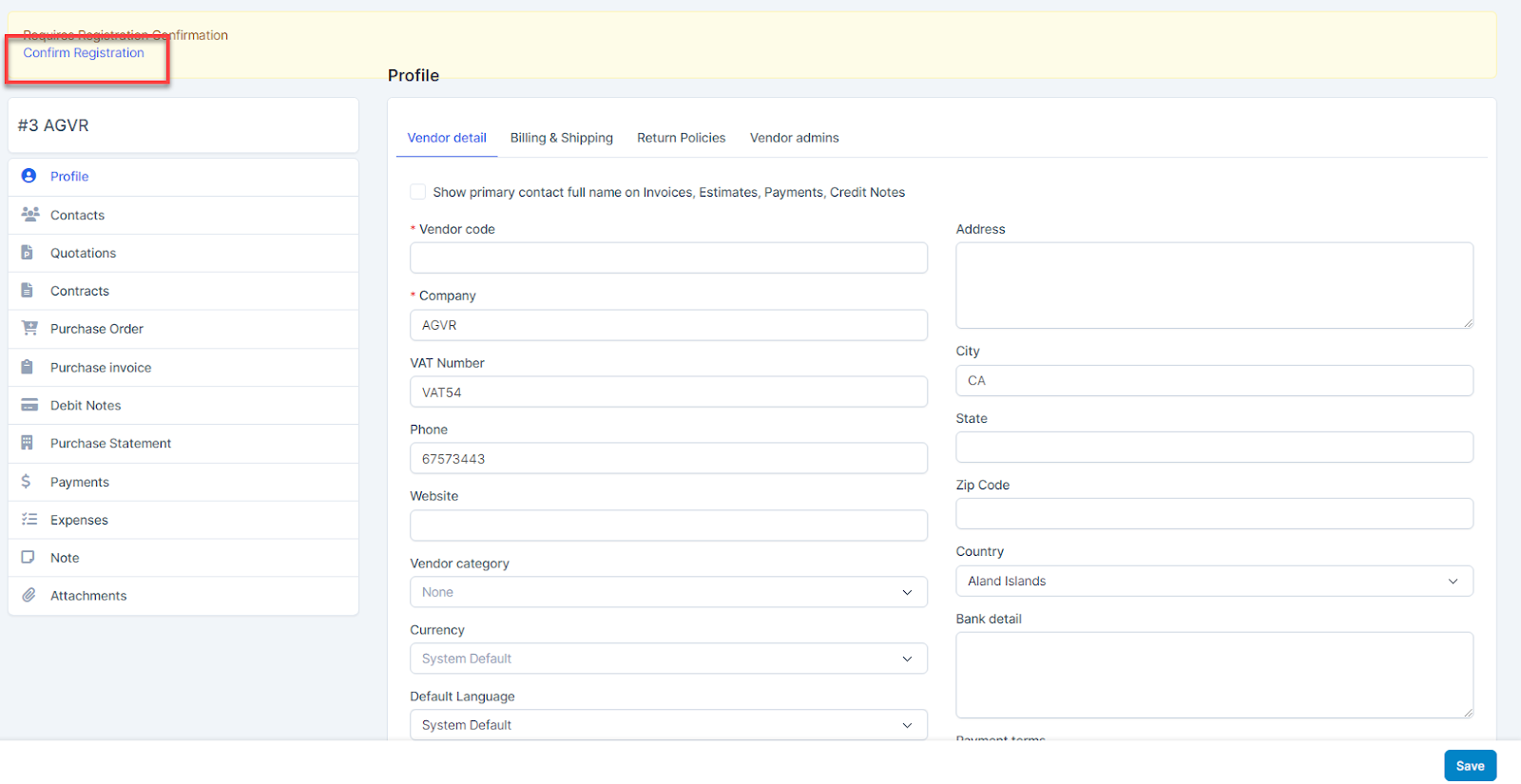 After successfully submitting the registration, wait for the admin's approval - ნაბიჯი 6. Go to მომწოდებელი menu -> Click Confirm registration to approve the vendor account registration request.